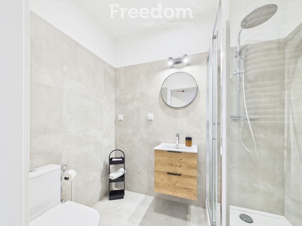 - ŁAZIENKA z prysznicem, umywalką, wc, lustrem i szafką wiszącą