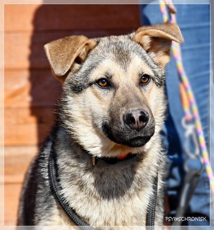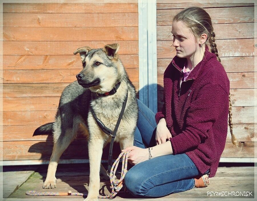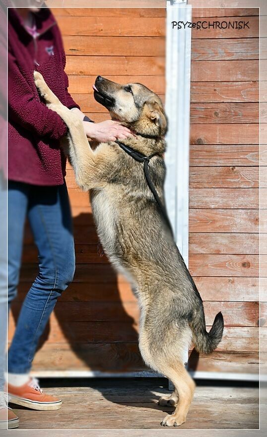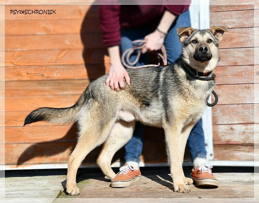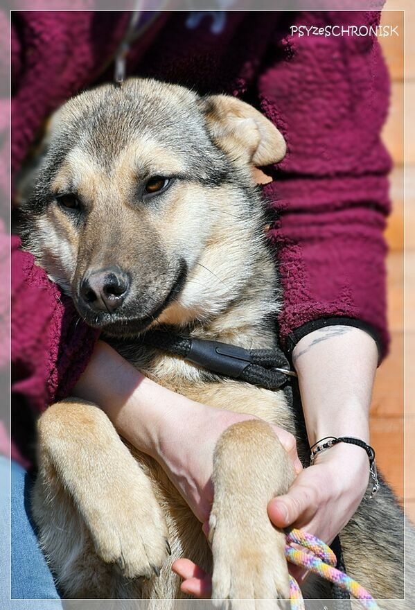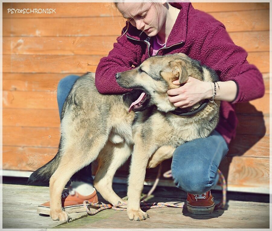 ALAN - wilczak czechosłowacki z jakąś domieszką z Północy. Prywatnie niespełna roczny smarkacz, przemiły, mięciutki, jeszcze w ruchach ciągle "plastelinowy", jak to szczeniaki. Przykleja się od razu do człowieka, gramoli na kolana, wtula jak najbardziej. Jest bardzo ufny i garnie się do ludzi z łatwowiernością dzieciaka - a przecież został przez nich skrzywdzony, skoro trafił do schroniska. Trochę jest ciągle gapowaty, choć pewnie wyrośnie na bystrzaka. Jest przy tym bardzo ładnym psem o wiecznie uśmiechniętej mordzie, tylko ma tego pecha, że w schronisku robi się niewidoczny: w takim rozmiarze i takim kolorze. W ten sposób upłynie mu pierwszy schroniskowy rok, potem drugi, trzeci... Alan dzieli schroniskowy kojec z paroma dzikusami; kiedy weszliśmy do kojca, aby im też zrobić zdjęcia, one przed ludźmi uciekały, gdzie pieprz rośnie, jakby diabła zobaczyły - a pomiędzy nimi plątał się on: najszczęśliwszy, że ma gości i że przyszli właśnie do niego. Taki to dobry, przesympatyczny pies.Alan ma niespełna rok. W schronisku jest od grudnia 2025r.