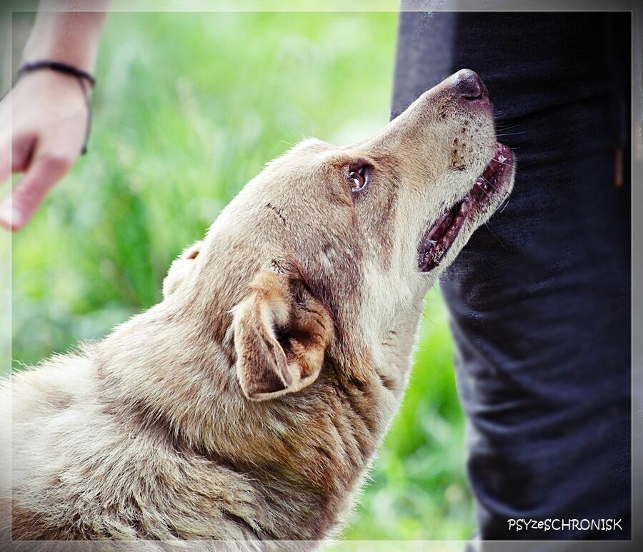 Jest starym psem, ale widać po nim, jak bardzo teraz cieszy się życiem. Pogodny, uśmiechnięty, bardzo szuka kontaktu z człowiekiem i zabiega o jego uwagę. Zachowuje się niemal jak młody pies: lubi spacery, lubi też inne psy, potrafi bawić się do upadłego z azylowymi podrostkami.