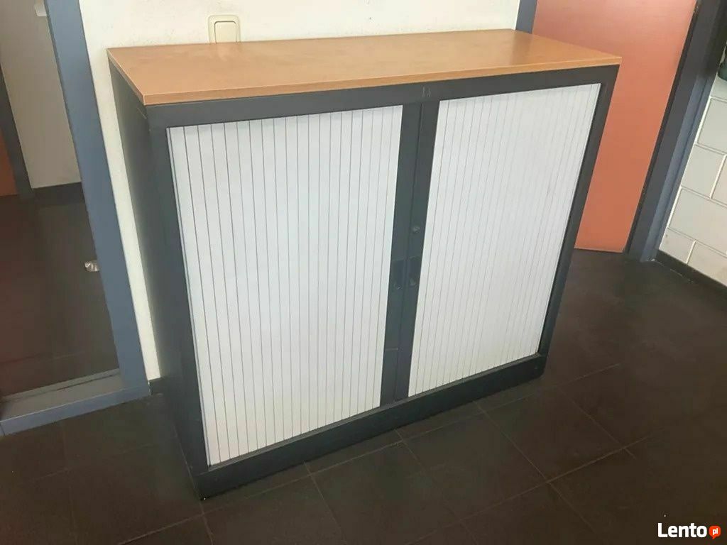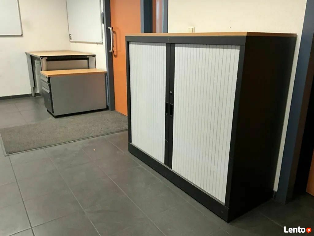 Możliwość zakupu pozostałych mebli biurowych ze zdjęć: szafka z drzwiami żaluzjowymi. Kontenerek na dokumenty w tym samym kolorze. Fotele ergonomiczne.