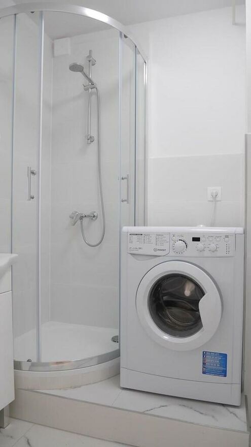 Łazienka: umywalka, lustro, WC, prysznic, pralka.