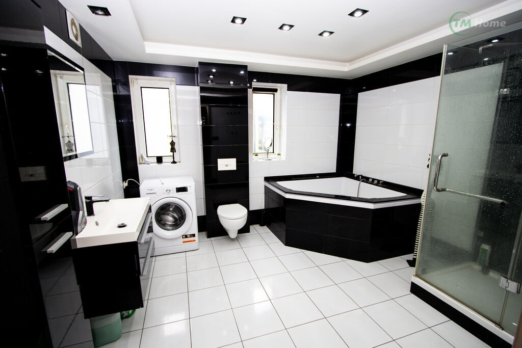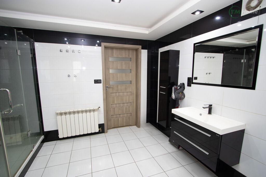 Duża łazienka: wyposażona w wannę z hydromasażem oraz prysznic