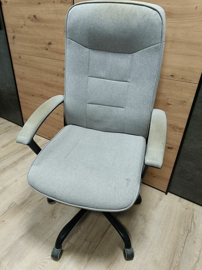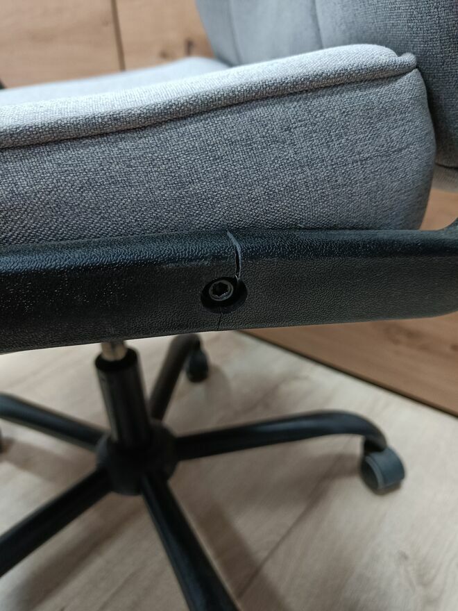 Wygodny fotel biurowy marki JYSK w szarym kolorze. Posiada regulowane oparcie i podłokietniki, zapewniając komfort podczas pracy. Idealny do domowego biura lub przestrzeni biurowej.Z lewej strony pęknięte mocowanie podłokietnika. Prawdopodobnie da się skleić.