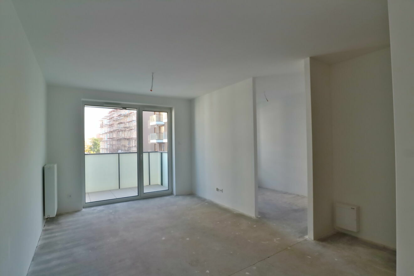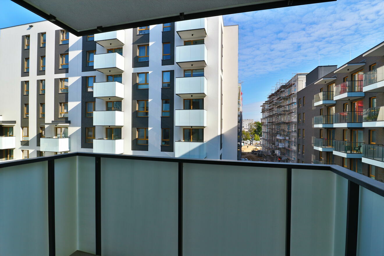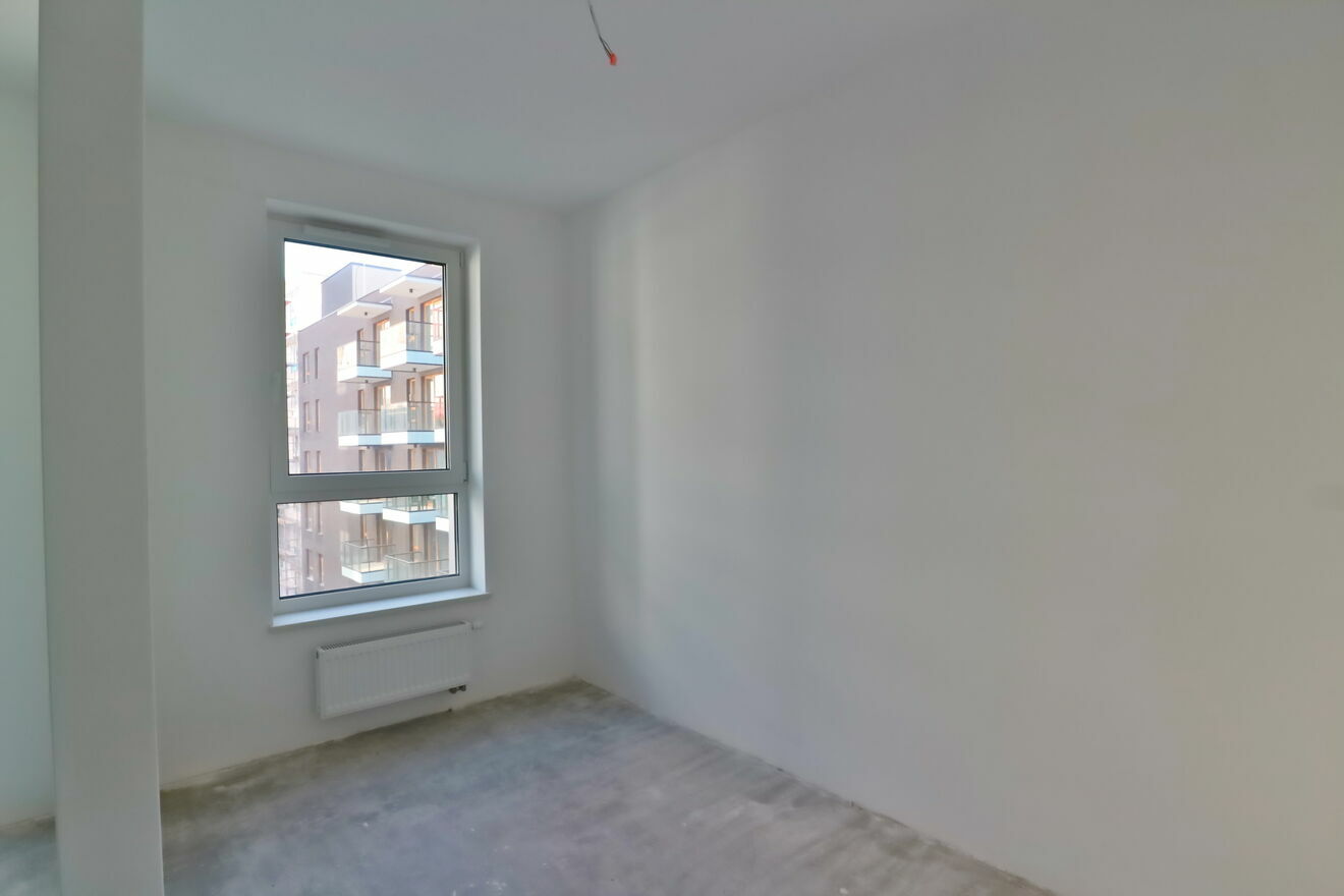 Stan deweloperski. Ścian szpachlowane i pomalowane na biały kolor. Całkowicie wykończony balkon.