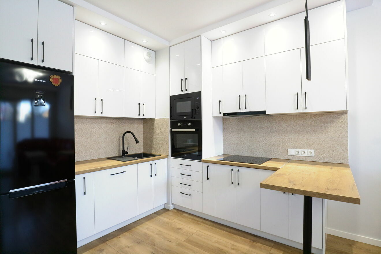 Wnętrze umeblowane, wraz z zabudową stałą i sprzętem agd.