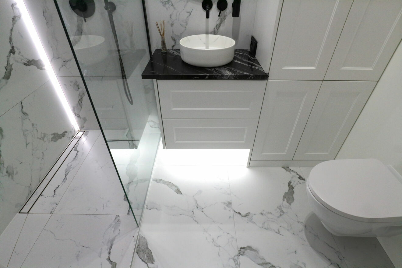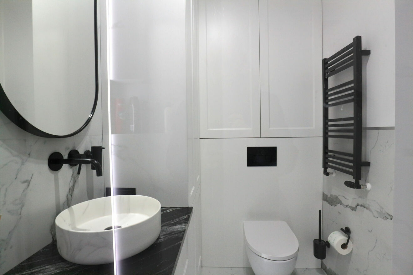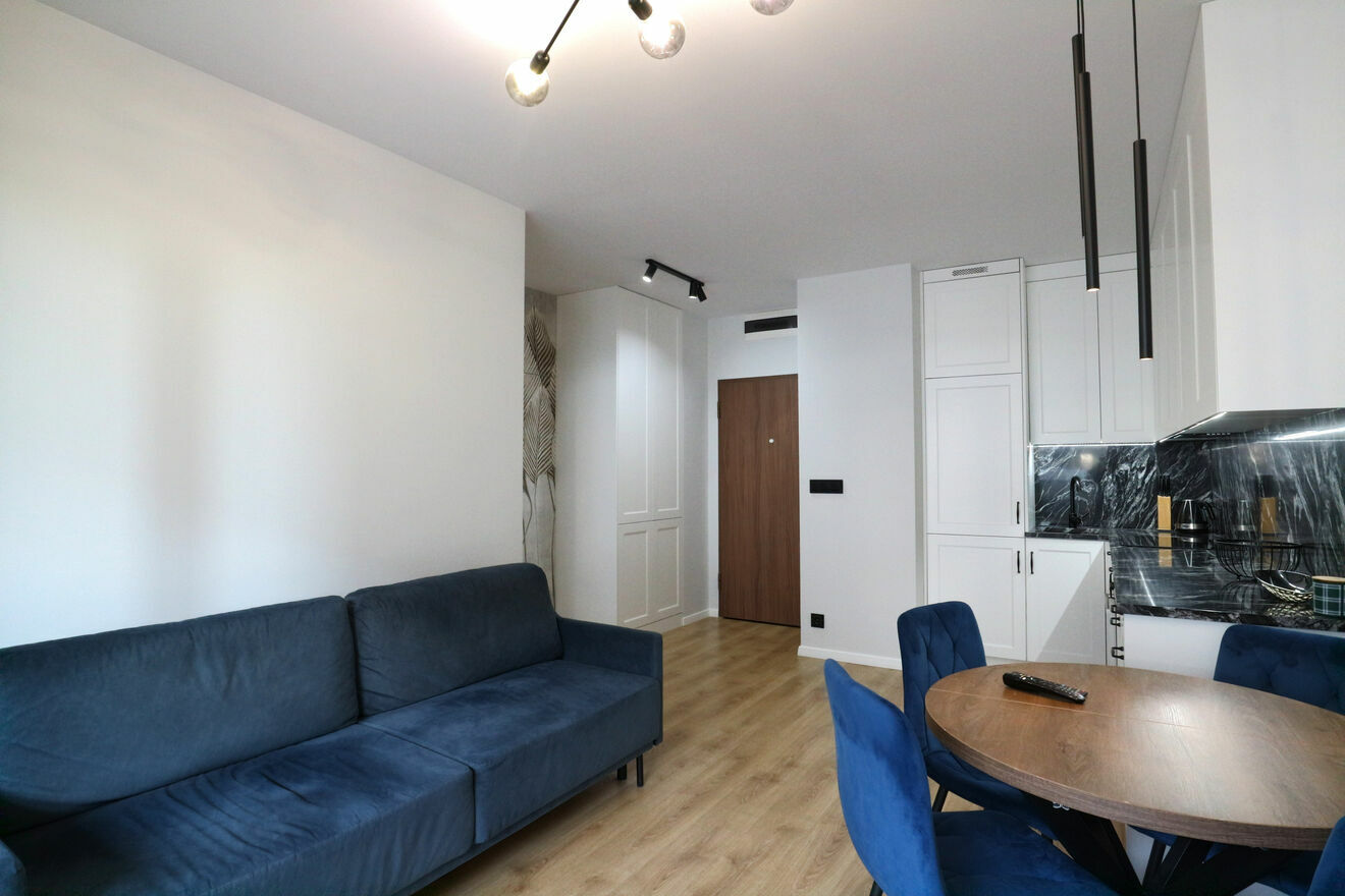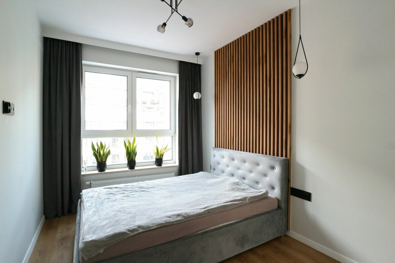 Materiał wykończeniowy: podłoga panel/gres; zabudowa stała w sypialni korytarzu i kuchni; duży blat roboczy w wersji kamień/granit; ściany tapeta ozdobna. W zabudowie kuchennej lodówka, zamrażarka, indukcja, piekarnik.