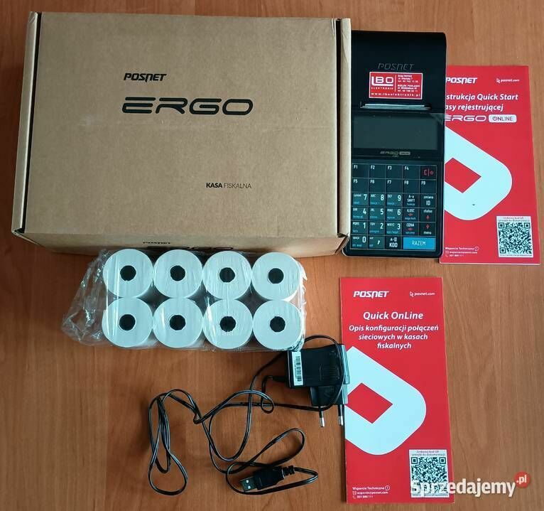 W zestawie: kasa fiskalna ERGO Online oryginalny zasilacz oryginalne pudełko instrukcja obsługi