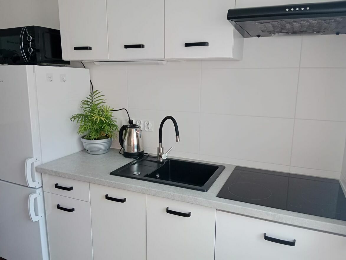 Aneks kuchenny: stół z 2 krzesłami, mikrofalówka, czajnik elektryczny, lodówka, indukcja.