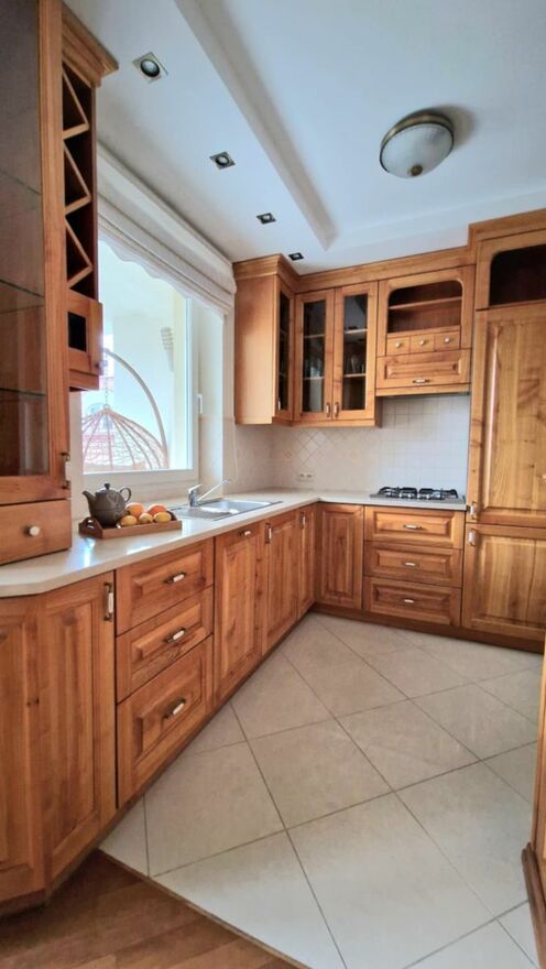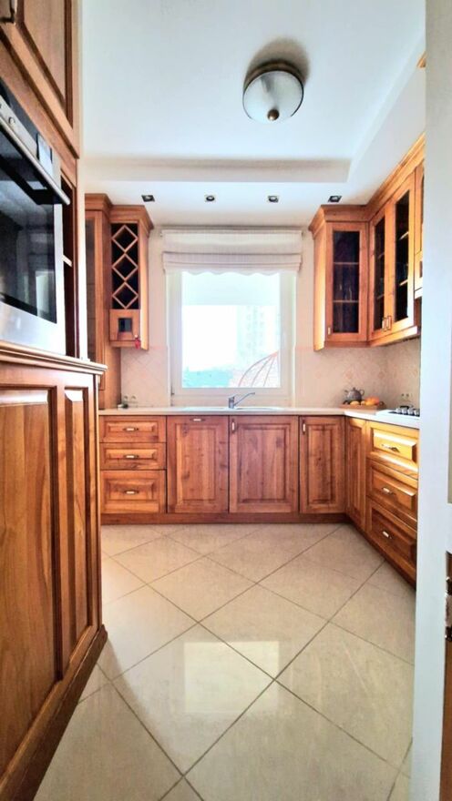 Mieszkanie jest w pełni wyposażone - w kuchni znajduje się zmywarka, piekarnik, płyta gazowa, okap oraz pełna zabudowa meblowa. W łazience pralka została estetycznie ukryta w zabudowie, co zapewnia porządek i spójny wygląd wnętrza.