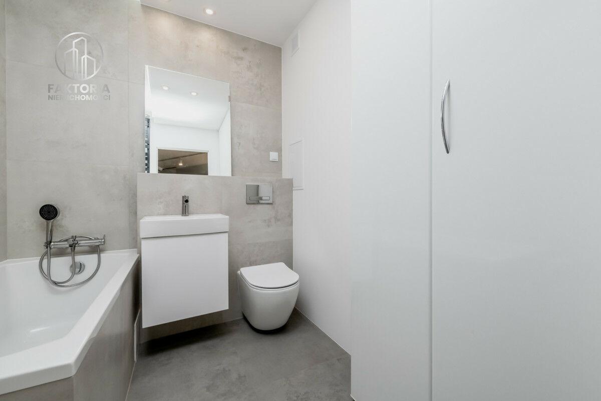 Duża łazienka z wanną, miejscem na pralkę oraz pojemną szafą do przechowywania.