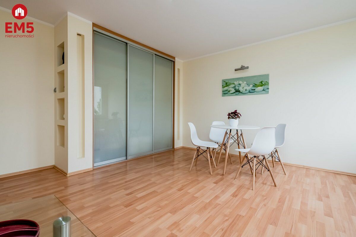 - jasny salon z szafą w zabudowie z wyjściem na balkon