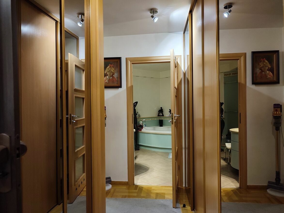 Nieruchomość znajduje się na szóstym z siedmiu pięter i ma powierzchnię 77.2m2. Składa się z korytarza, salonu z aneksem kuchennym, dwóch pokoi, łazienki i balkonu. Dodatkowo w sypialni znajduje się wejście do mniejszego pomieszczenia służącego jako pomieszczenie gospodarcze, idealnie nadające się na garderobę. Pokoje są przestronne i jasne, okna usytuowane są w kierunku północno-zachodnim. Widoczne na zdjęciach bogate wyposażenie (meble, klimatyzacja, RTV i AGD) jest uwzględniona w cenie nieruchomości. Czynsz wynosi 1400 złotych.