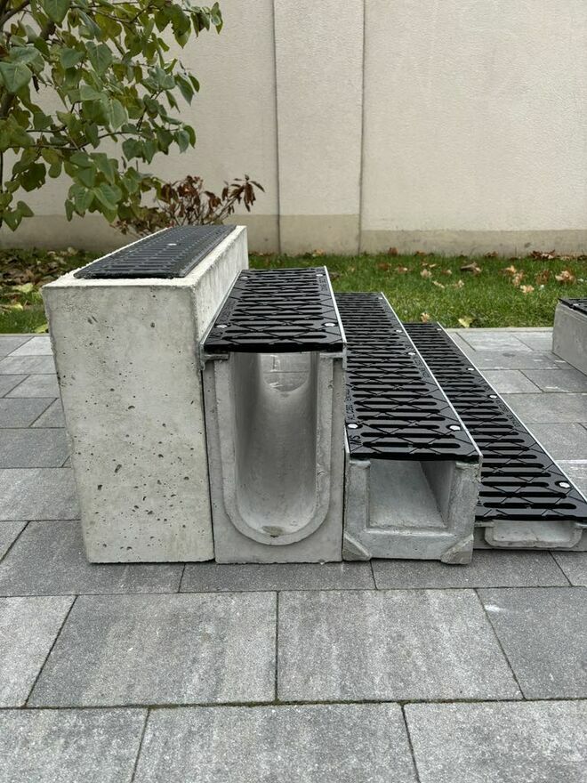 4. 100 cm (dł.) x 15,5 cm (szer.) x 14,5 cm (wys.) (bez listwy — kratka leży bezpośrednio na betonie)