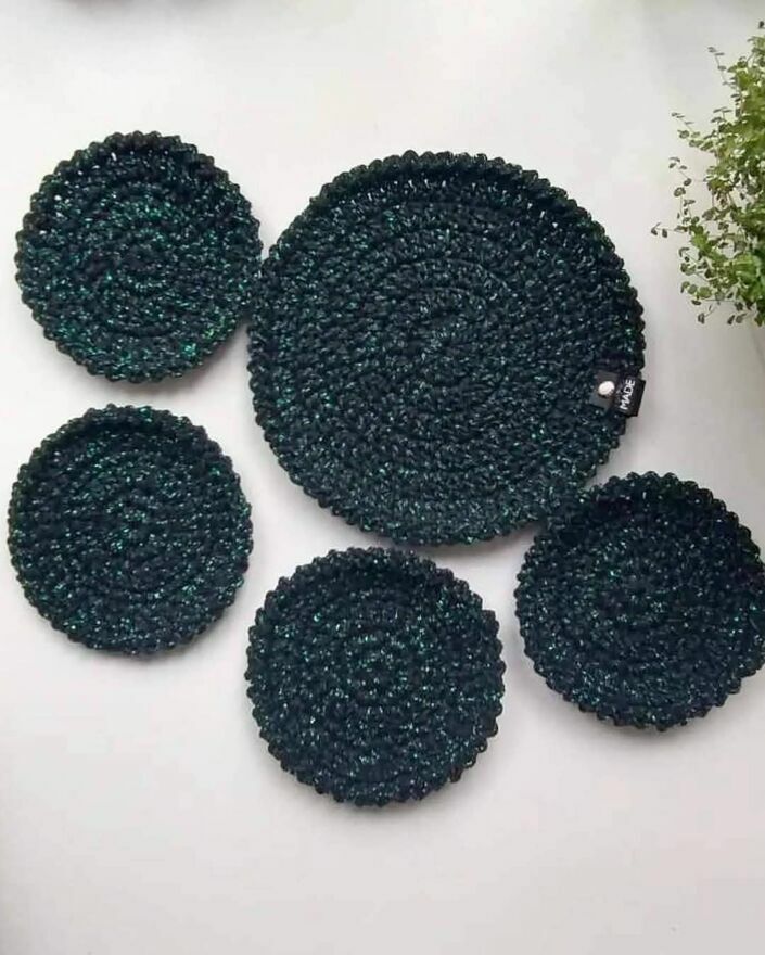 Podstawka pod dzbanek (19cm), oraz 4 podstawki pod filiżankę (13 cm).