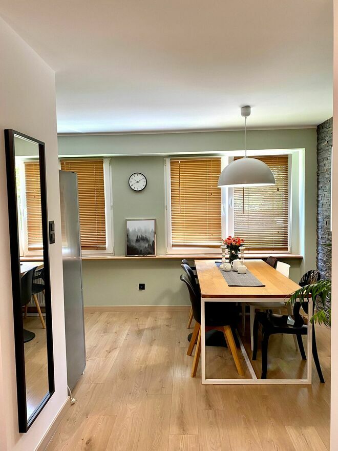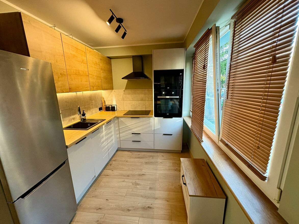 Nieruchomość wyposażona w m.in. lodówkę, piekarnik, płytę indukcyjną, mikrofalę, zmywarkę, rogówkę, dwa łóżka, stół w jadalni.
