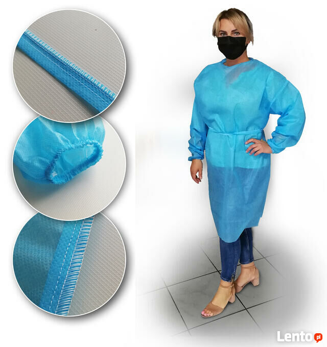 Fartuch ochronny wykonany z tzw. włókniny medycznej grubej 40g.