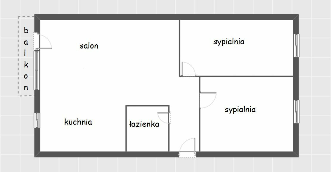 Na przestrzeń mieszkalną składa się: pokój dzienny z kuchnią, dwa pokoje sypialne, korytarz i łazienka z wc.
