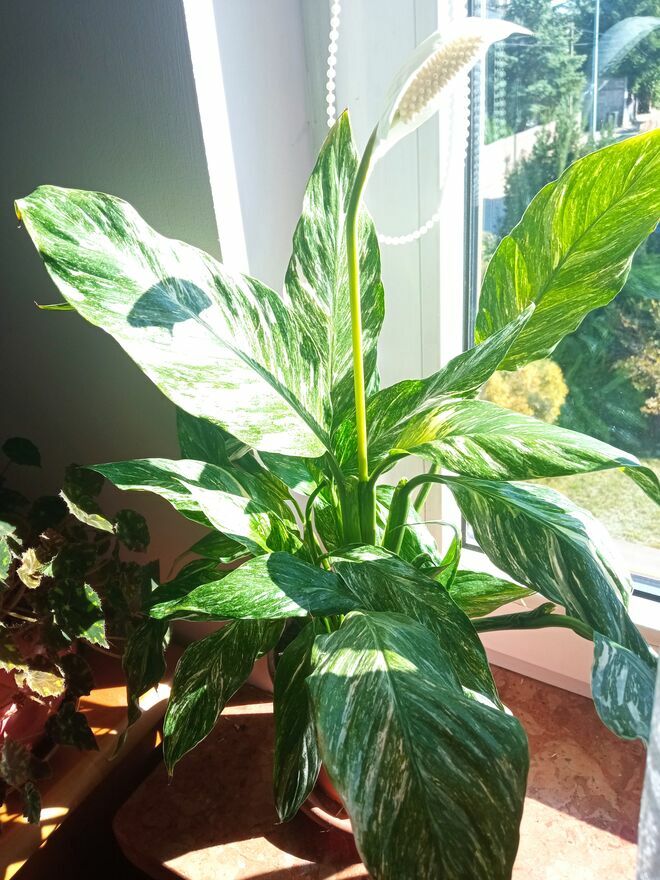 Skrzydłokwiat , wys. ok 50 cm i rośnie; liście z białymi plamami , rozkwitł ; odmiana Diamond-25 zł