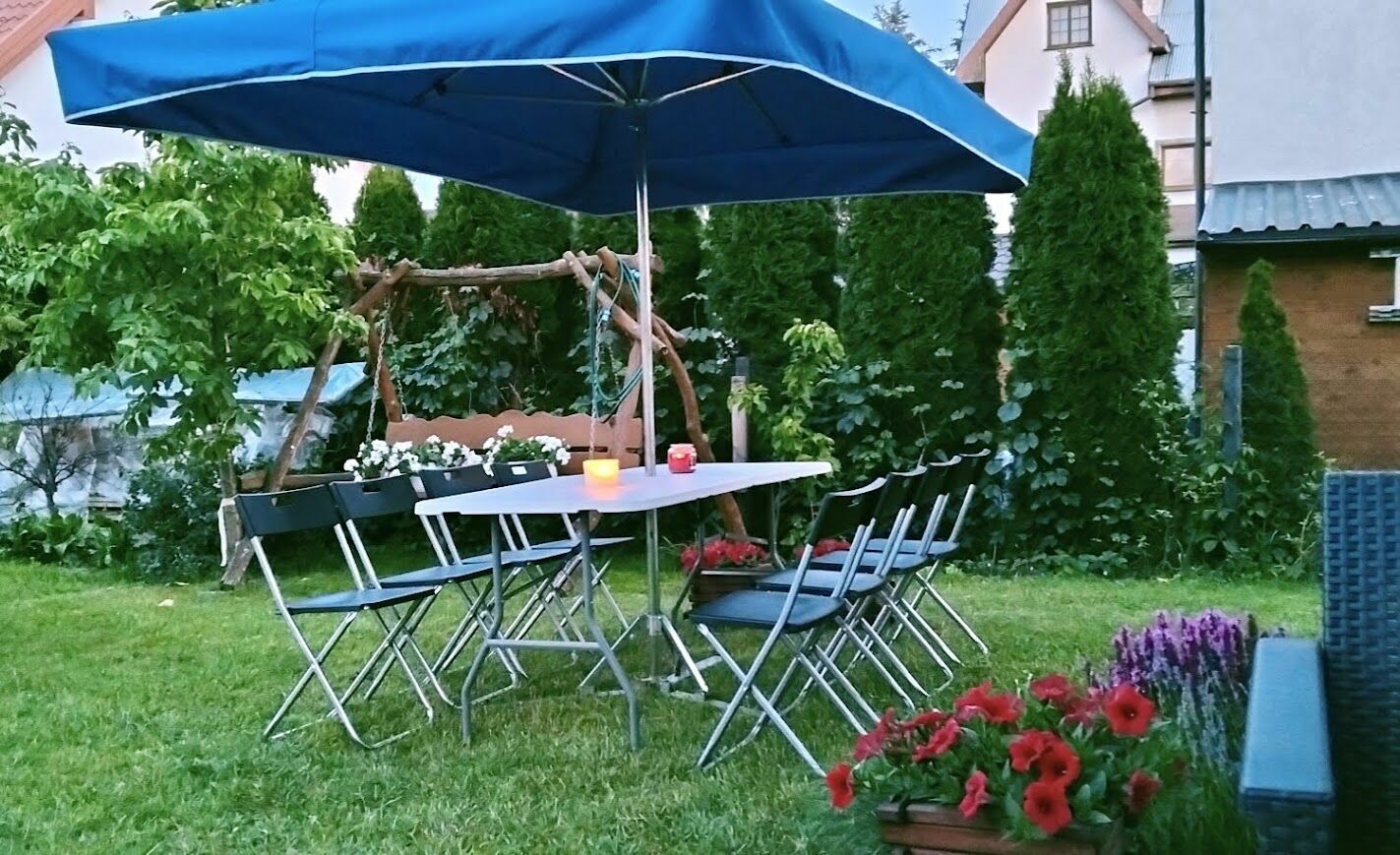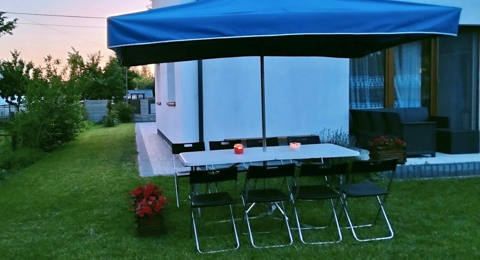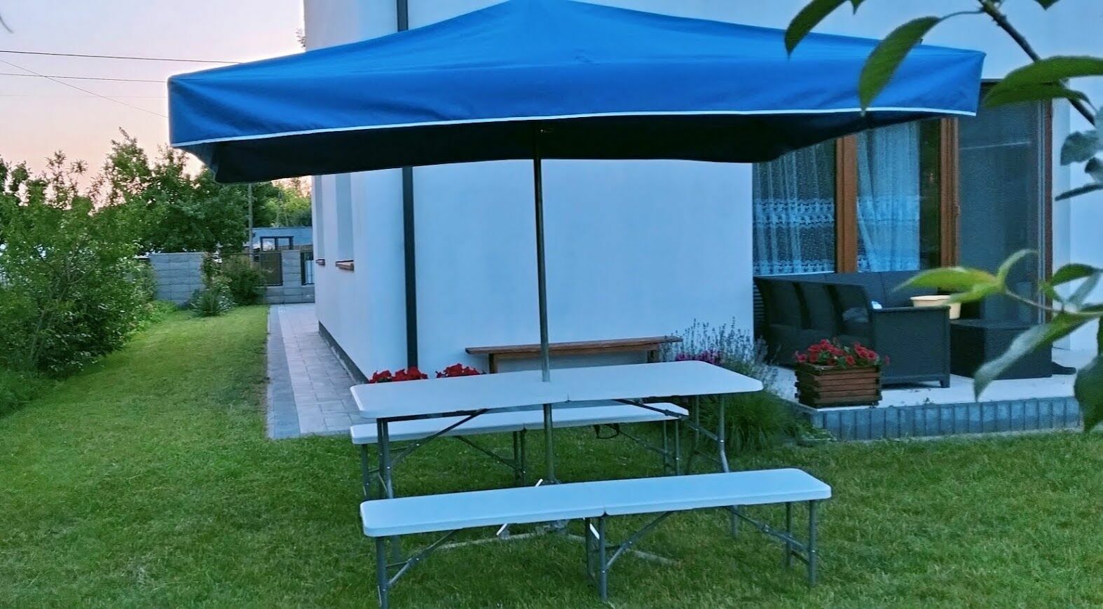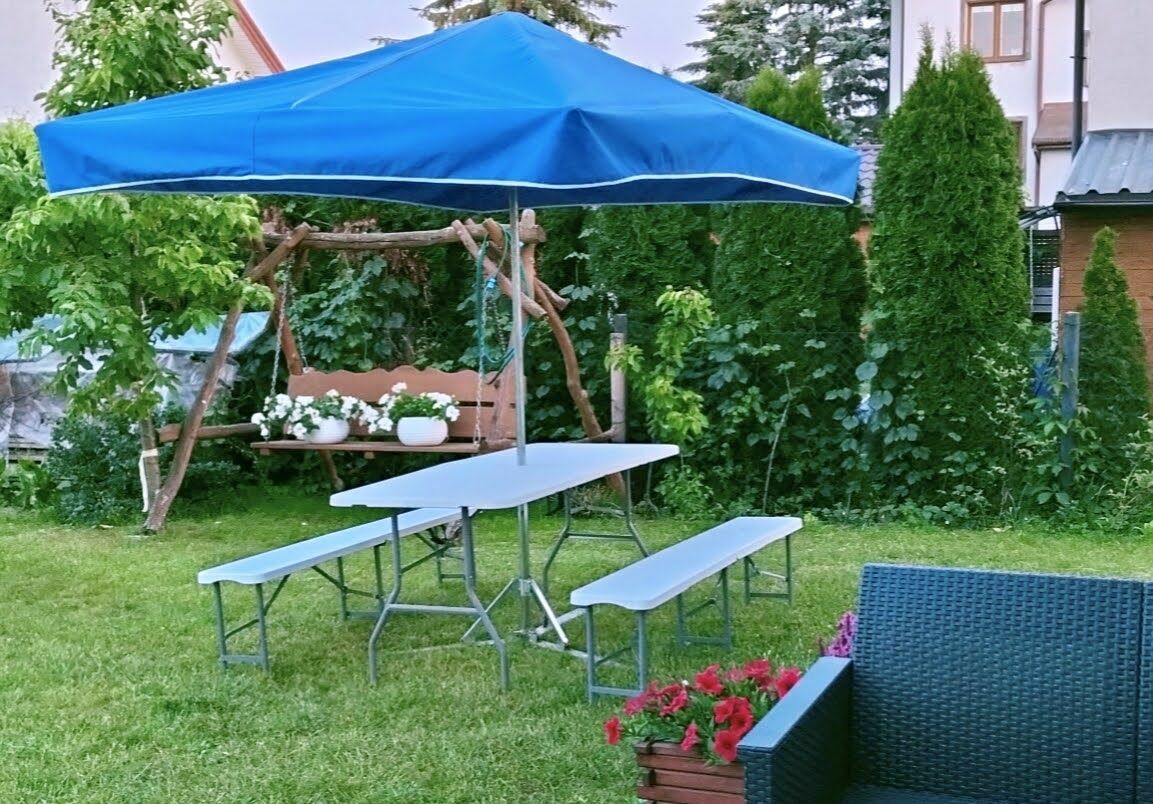 - Parasole ogrodowe 300x200cm (można go wstawić w środek stołu cateringowego i stanowi on wówczas zadaszenie całego stołu razem z ławkami)